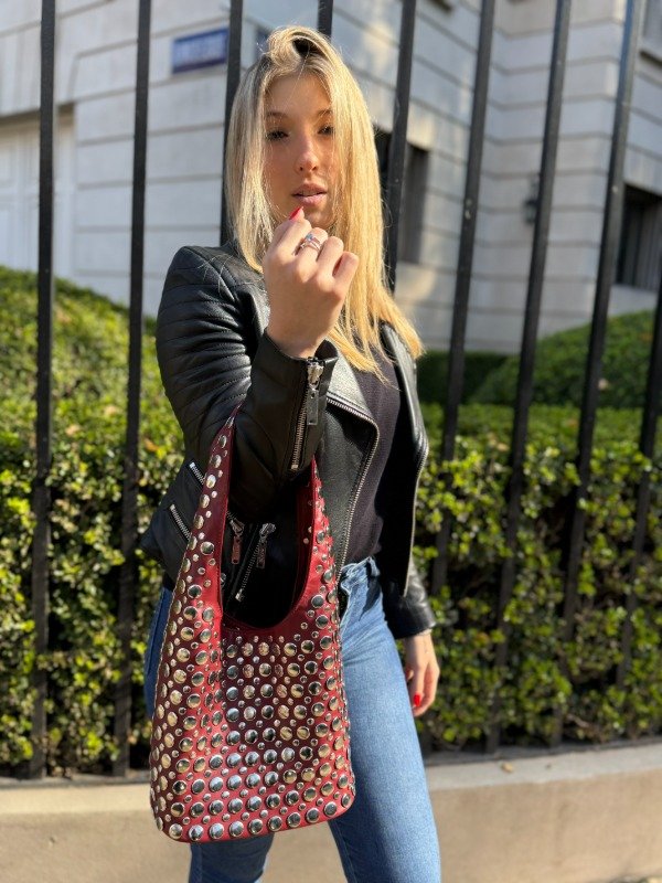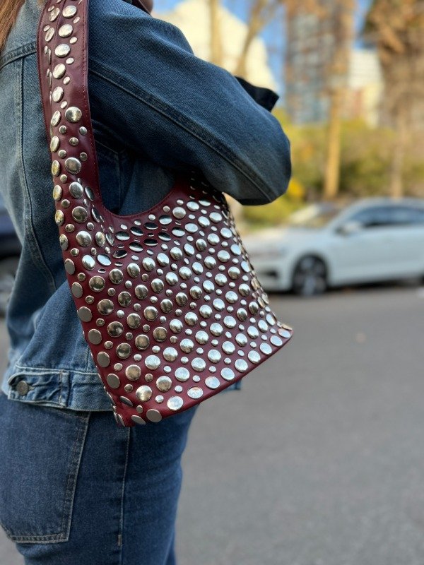 Su color bordo profundo se fusiona con una superficie completamente intervenida por tachas metálicas, logrando un contraste poderoso y lleno de energía .