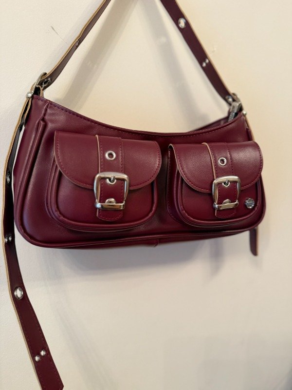 Cartera que tiene mucha presencia y detalles que la hacen única: el tono bordó produndo, las hebillas metálicas al frente y los blsillos marcados transmiten fuerza, estilo utilitario y personalidad.