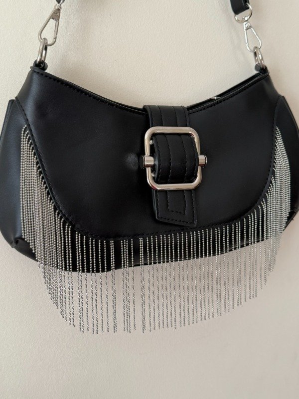 Un diseño de impacto, con flecos de cadenas metálicas y hebilla protagonista.